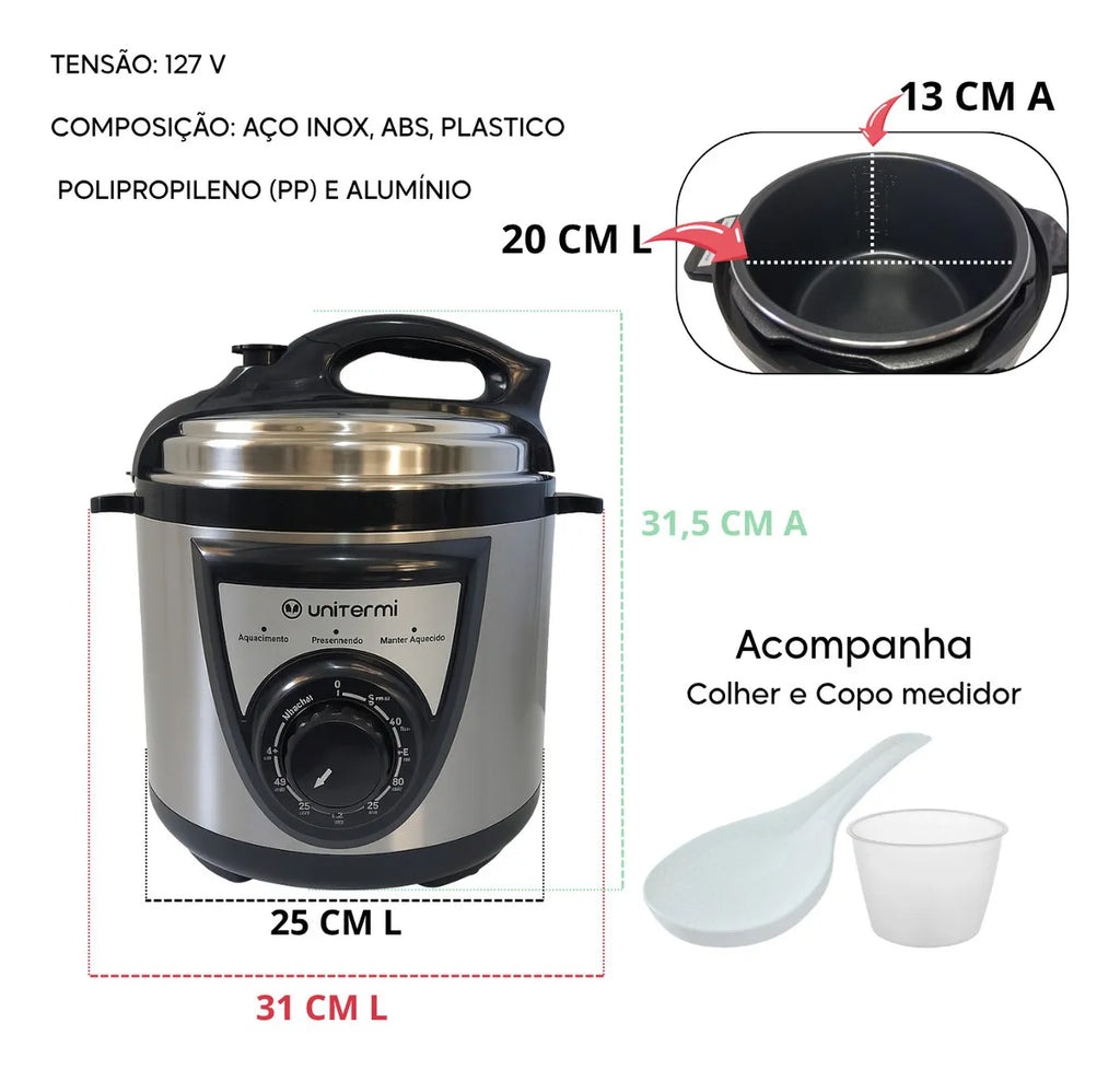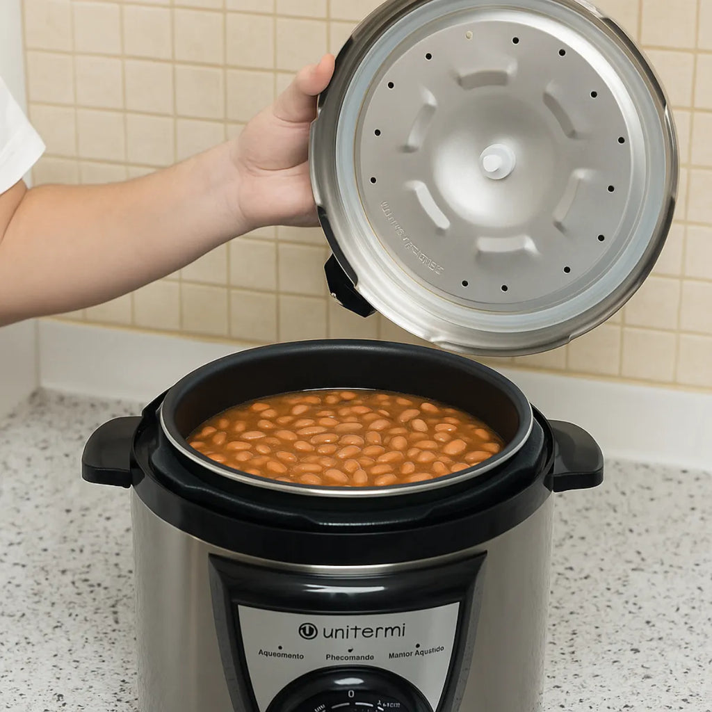 Várias preparações Este produto oferece várias funções para fazer seus preparos. Isso facilitará o seu dia-a-dia, pois, com uma única panela, você resolverá seus pratos. Desligamento automático Quando usamos o desligamento automático, temos a tranquilidade de que, quando a comida estiver pronta, o cozimento será suspenso. Além disso, esse recurso permite que você realize outras atividades simultaneamente. Manutenção da temperatura A função de manter os alimentos quentes permite preservar o sabor do que foi feito. Além disso, mantém a qualidade de qualquer preparação quente.